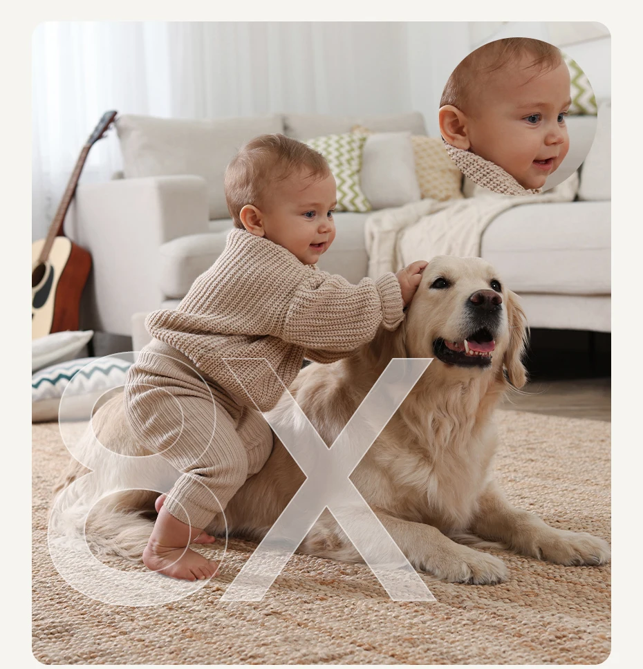 ✔ 360° Full Coverage + 8X Zoom – Enjoy a complete panoramic room view with 360° pan and 90° tilt. Zoom in up to 8X for close-up monitoring of pets, children, or security concerns.